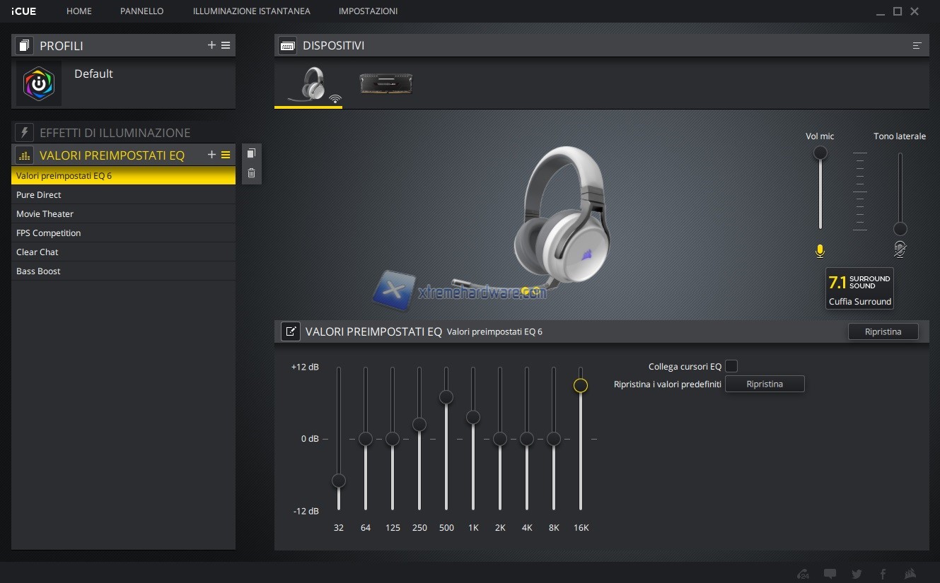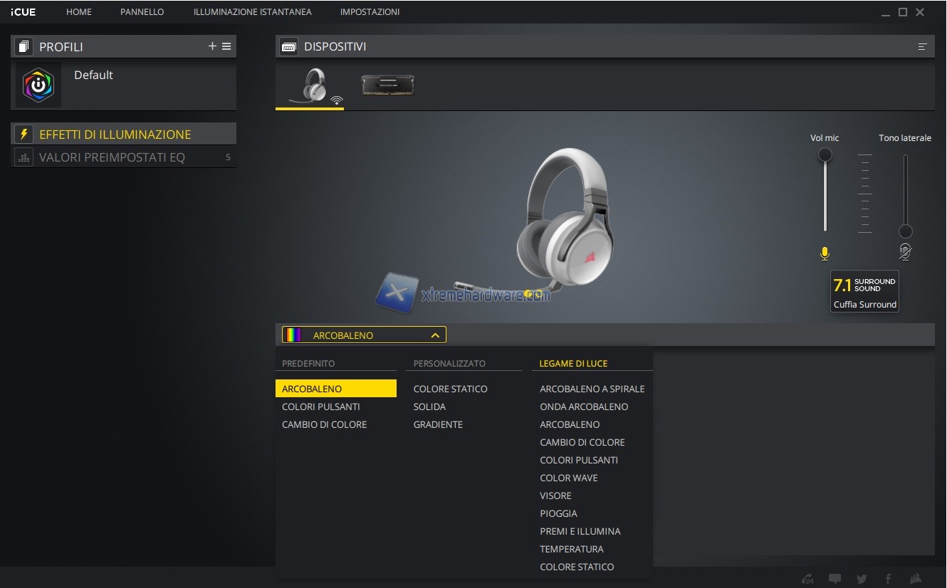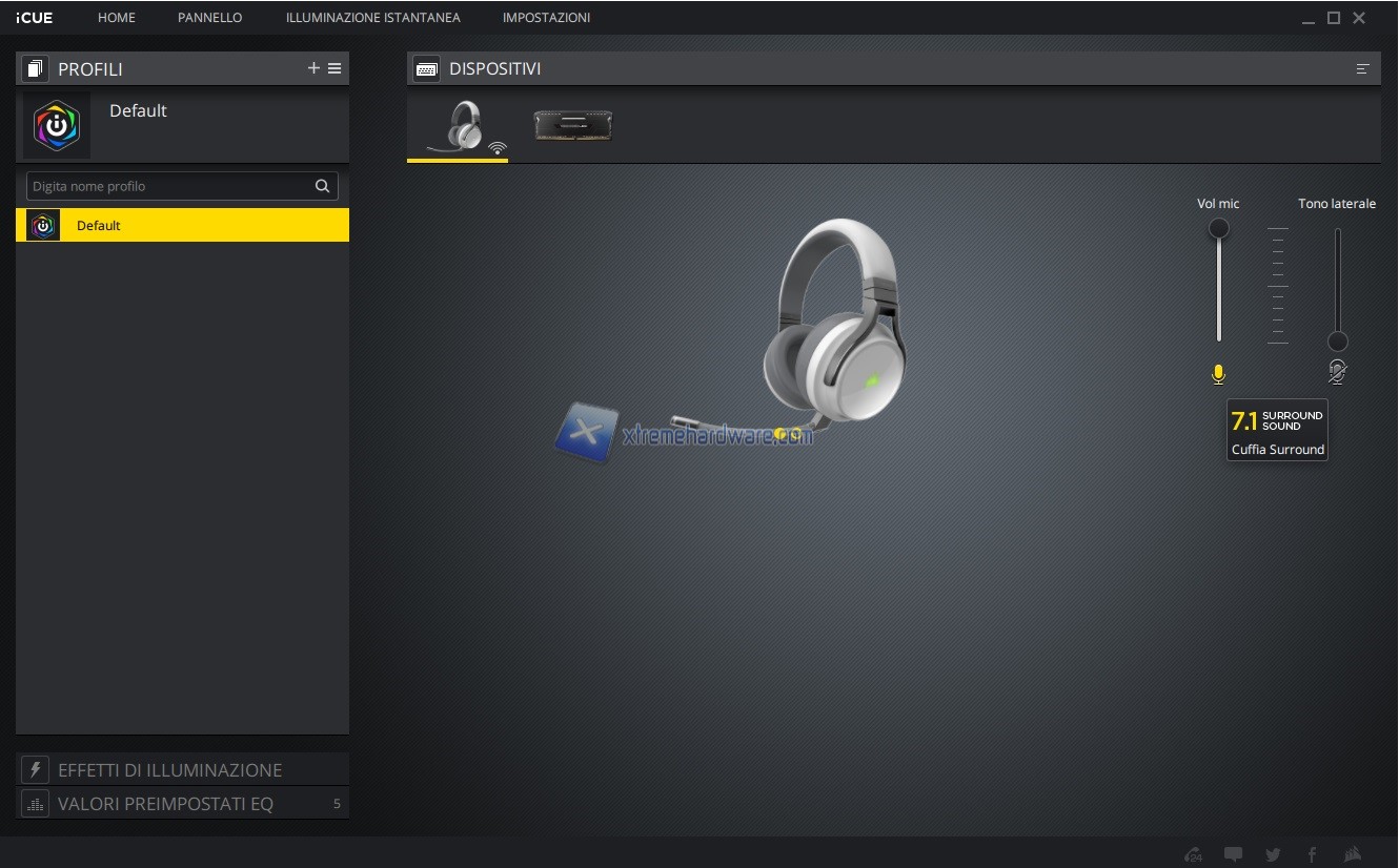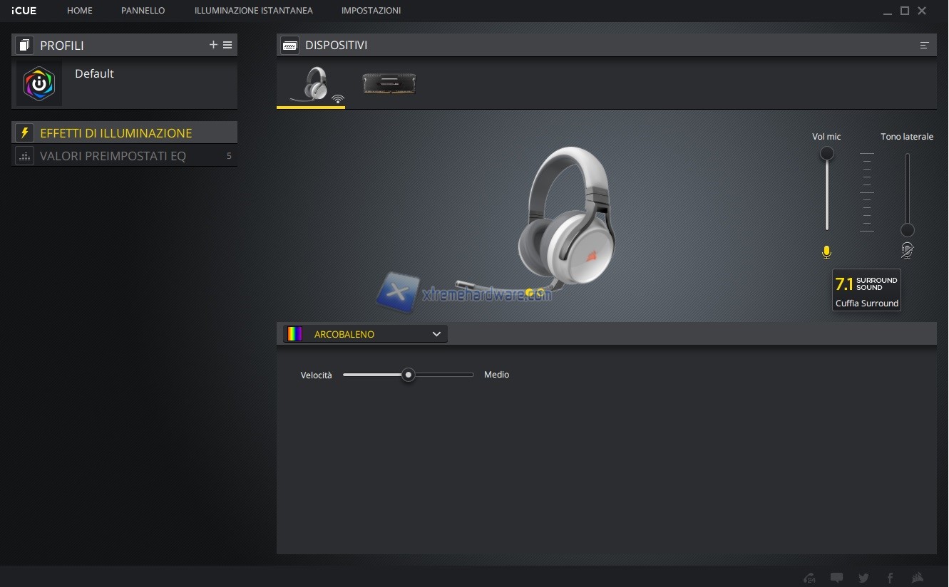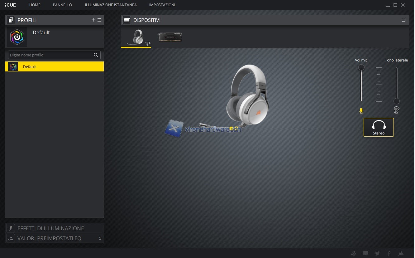 In questo capitolo invece vi riportiamo tutte le immagini relative l’ormai conosciuto e famoso software di gestione di periferiche e componenti Corsair iCUE. Software sicuramente molto completo e a mio avviso molto intuitivo. Tramite il software, in questo caso, potremo agire sull’illuminazione e relativi effetti, regolare il volume del microfono e eventuale Sidetone oltre che accedere ai Presets di equalizzazione o crearne uno ex novo se non dovessero essere di vostro gradimento.