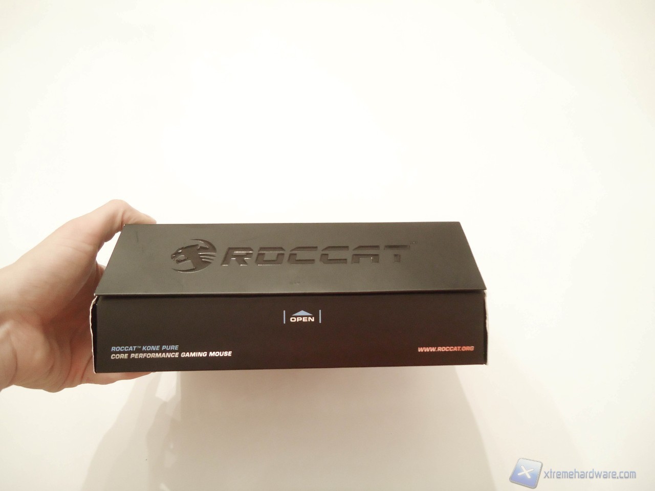 La scatola del Roccat Kone Pure riprende il design dagli altri prodotti Roccat differenziandosi solo per alcuni particolari. La forma non è la solita scatola quadrata usata da tutti gli altri brand concorrenti ma una confezione avente forma trapezoidale. Le dimensioni del packaging sono 220 x 190 x 90 mm e come colori principali sono ripresi quelli del marchio cioè il blu e il nero. Sul frontale troviamo centralmente l’immagine del mouse affiancata dalle sue caratteristiche principali.